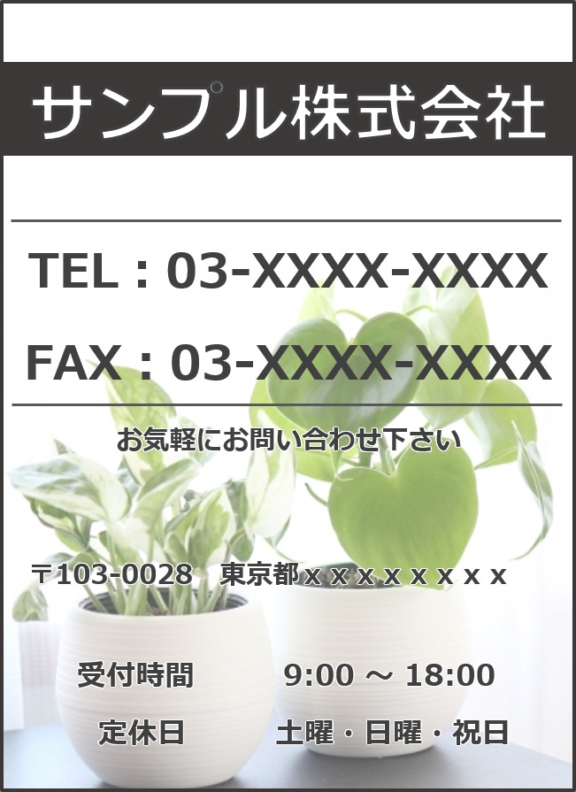 ご挨拶 はじめまして。 サンプル株式会社の「サンプル 一郎」と申します。 この度は弊社HPへお越しいただきありがとうございます。 お客様のために、よりよいホームページを提供できるよう社員一同対応させていただきます 住所 お困りの際はぜひ弊社にお任せ下さい! どんな些細な事でもお聞かせください 担当者がすぐに駆け付け、全力でサポートさせていただきます お気軽にお問い合わせ下さい お気軽にお問い合わせください03-xxxx-xxxx受付時間 9:00-18:00 [ 土・日・祝日除く ] お問い合わせ メールでの問い合わせは24H受付